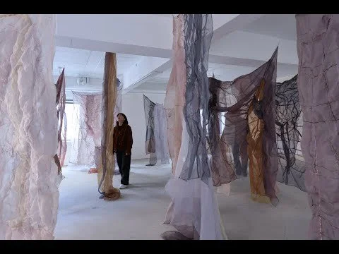 As people move through the space, walking behind the layers of fabric, their bodies become faintly visible.